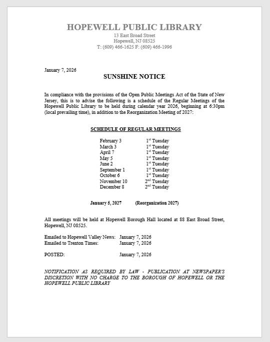 This Notice is posted at Hopewell Public Library, Hopewell Borough Municipal Hall, Hopewell Valley News and Trenton Times.